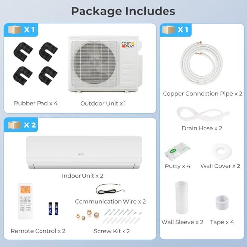 Experience ultimate comfort with COSTWAY’s Thundrive 18k BTU Dual Zone Mini Split. Featuring 20 SEER2 efficiency, WiFi and Alexa compatibility, ductless inverter technology, and a sleek wall-mounted design. Easily control two 9000 BTU zones for energy-efficient cooling and heating all year round!