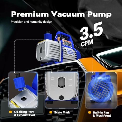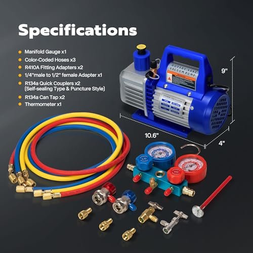 Optimize your HVAC repairs with VIVOHOME’s 110V 1/4 HP Rotary Vane Vacuum Pump & AC Manifold Gauge Kit. Featuring a powerful 3.5 CFM single-stage pump, accurate thermometer, and compatibility with R134a, R12, R22, R502, and R410a refrigerants. Perfect for efficient air conditioning and refrigeration recharging!