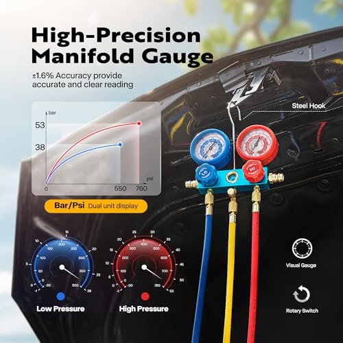 Constructed with high-quality materials, this vacuum pump and gauge set kit is built to withstand the demands of regular use in both professional and DIY settings. The sturdy design ensures longevity and reliable performance over time.